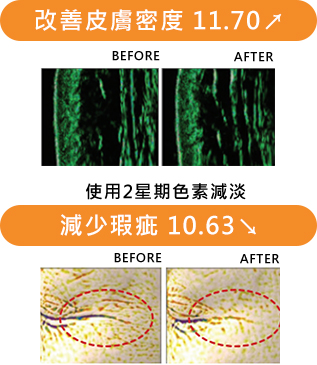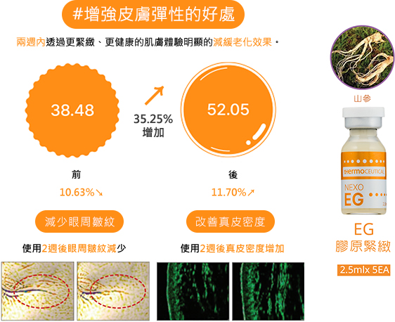 兩週內即可明顯體驗到增加密度和改善皺紋等延緩老化的抗衰老功效。 山參外泌體、積雪草葉外泌體可溶性維他命(A,B1,B2,B3,B5,B6,B7,B9,C,D,E,K)透過腺苷 有助於改善皮膚彈性和減少皺紋